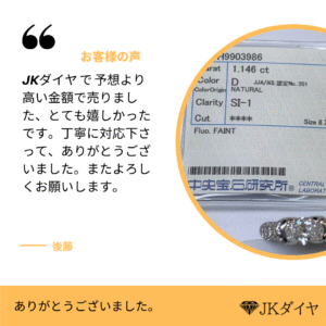 ダイヤモンド専門の輸入卸売業者として30年以上の実績を持つJKダイヤでは、常にお客様に対して誠実であることをモットーとしております。ダイヤモンドに精通した専門家による丁寧な査定で、最高の市場価格での買取が可能です。店頭、宅配、出張と、3つの便利な買取方法をご用意しておりますので、ぜひお気軽にJKダイヤの無料査定をご利用くださいませ。